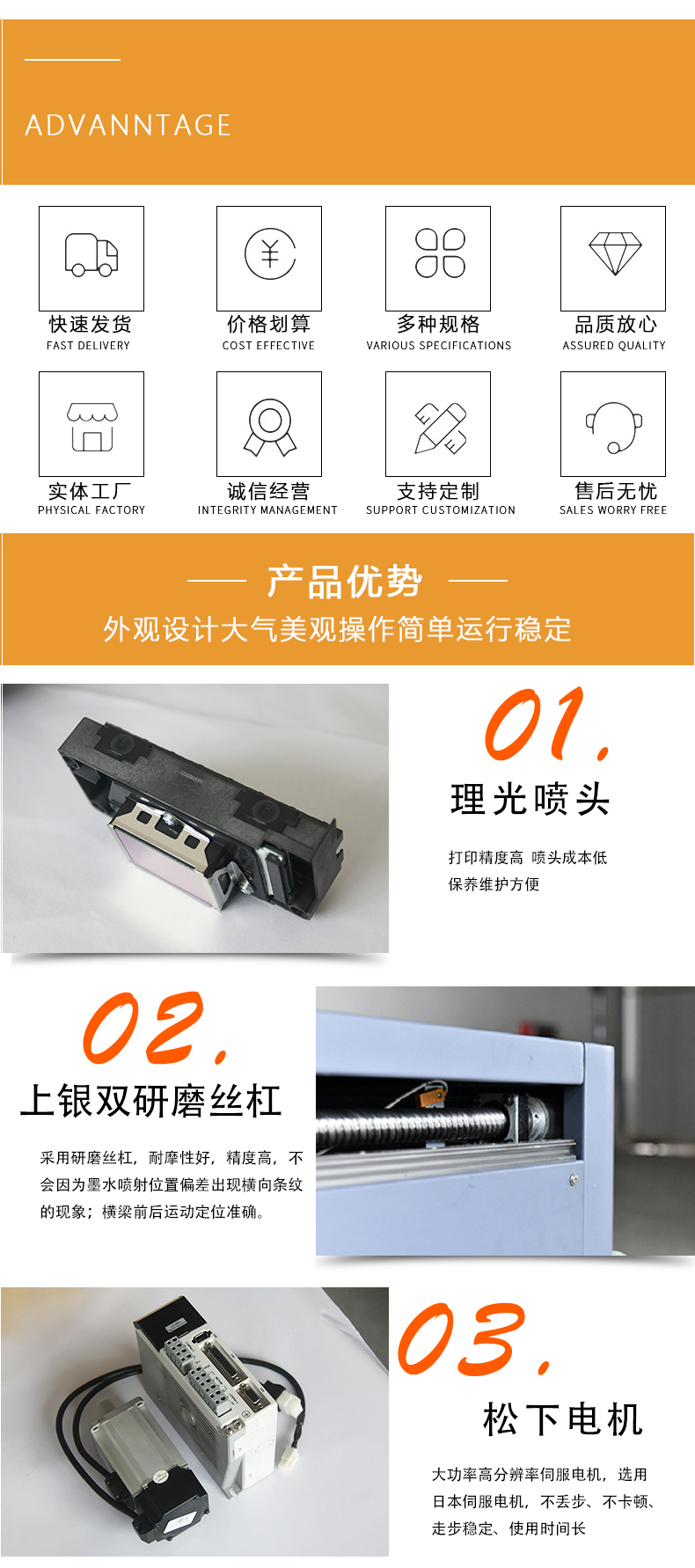 高科技研發的一款承載多功能、多行業、多領域的服務設備,性能穩定、精度好、速度快、壽命長,本機采用理光噴頭,適用廣告加工、工藝品行業、裝飾畫行業、手機殼彩印制作等行業。 可完全代替絲網印刷,移印,轉印,水轉印,柯式印刷等傳統人藝工藝,充分發揮其優勢降低企業成本。